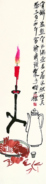 “有蟹盈盤,有酒滿壺,君若不飲何其愚。”齊白石在《蟹酒圖》中如此表達其心意。簡練的線條勾勒,稍事渲染,一盤一壺一紅燭,把秋日的暢達胸懷表達得淋漓盡致。