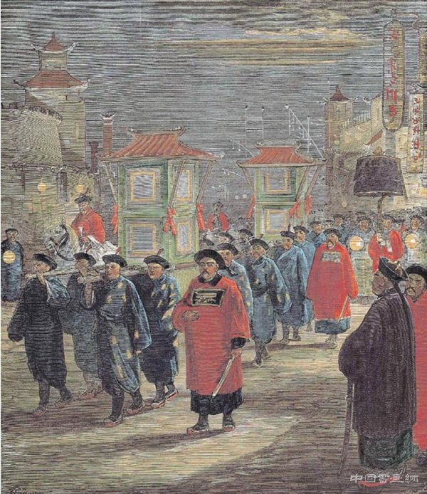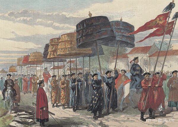 午夜迎娶的隊(duì)伍是個(gè)什么陣勢(shì)?辛普森為我們清點(diǎn)了一下,人員計(jì)有:端親王騎馬上,48匹小白馬由內(nèi)侍牽著,32人舉旗,48人撐著華蓋,后面又跟著20頂形制相似但色彩各異的華蓋,192人提帶“囍”字的燈籠,然后是騎在馬上的其他親王,迎娶新娘的32抬大轎,后面還有100個(gè)騎兵,200個(gè)步兵,無(wú)數(shù)供桌與華蓋。除此之外,沿途遍布清兵,騎馬的禁軍頭領(lǐng)來(lái)回跟著巡視。