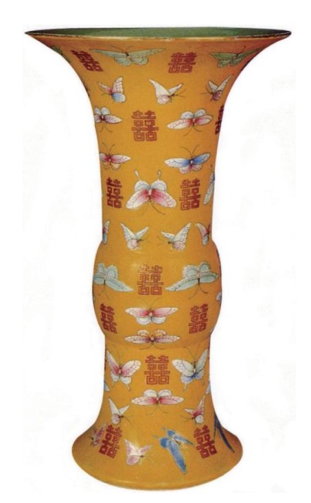 同治大婚瓷皇帝大婚,慈禧太后特意為兒子打造了一套喜瓷,底子亦為顯示皇家特權(quán)的黃色。此為黃地喜蝶紋花觚,也應(yīng)當(dāng)是儀仗抬著送入宮中的。同治大婚瓷耗資十三萬(wàn)兩白銀燒制,流傳至今。