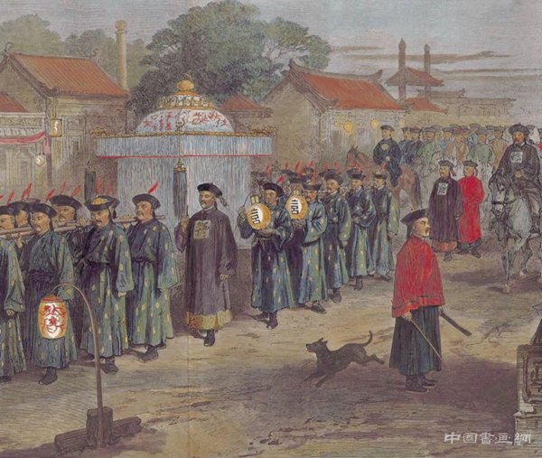 十月十五日的下午4點(diǎn),迎娶新娘的隊(duì)伍浩浩蕩蕩,從紫禁城向新娘家進(jìn)發(fā)。按照大清皇室的規(guī)定,迎娶皇后要遵循一套非常繁復(fù)嚴(yán)格的規(guī)矩。遠(yuǎn)遠(yuǎn)望去,迎親隊(duì)伍前面是羽錦華蓋開(kāi)路,這是皇家最高尊嚴(yán)的象征。華蓋的順序、顏色、舉旗人的爵位,都有嚴(yán)格的講究。帶領(lǐng)這支隊(duì)伍的,是騎著大白馬的皇叔,即道光皇帝的第五個(gè)兒子端親王,他是整個(gè)婚娶儀式的司儀。最后面是抬花轎的隊(duì)伍。抬轎人的行頭,據(jù)親眼所見(jiàn)者說(shuō)是紅袍上帶著白點(diǎn),顯然下面的幾幅畫(huà)都被點(diǎn)錯(cuò)了顏色。每位轎夫都經(jīng)過(guò)嚴(yán)格篩選,在這一時(shí)刻到來(lái)之前,他們已進(jìn)行過(guò)無(wú)數(shù)次訓(xùn)練,有時(shí)轎中要抬著一碗水,要練到一滴水都不灑才算合格。