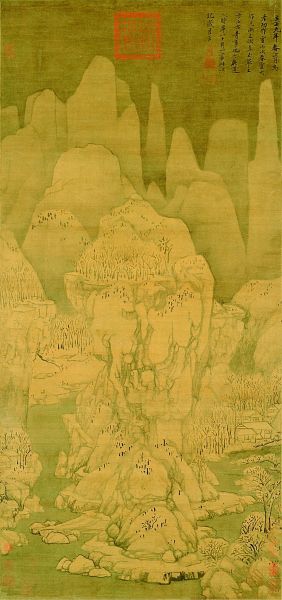 《九峰雪霽圖》畫作的正面中心突出了亭亭兀立的主峰山石變化,嶙峋峻峭、奇倔勁挺之形狀直接迎門;峰巒之上的勾勒點(diǎn)厾示意著灌木雜樹的枝干突破雪被,與峰頂上成片叢樹適成對(duì)比,相映成趣。黃公望有意將變化豐富的巖崖通過(guò)中鋒筆墨的型塑,表現(xiàn)出經(jīng)積雪覆蓋的石質(zhì)紋理,將畫作的視覺(jué)重心刻意引向中端偏下,以形成畫面秤砣壓卷的分量。而主峰下端的石灘釣巖則四向伸展,穩(wěn)穩(wěn)地扎進(jìn)溪澗流水之中,外輪廓講究且變幻有致,又在畫面兩側(cè)添加斷巖、崗阜和錯(cuò)落相契的樹石,以呼應(yīng)河澗的流向,還巧妙地設(shè)計(jì)將流水上游的源頭隱在主峰背后,讓水的流向曲折環(huán)繞灘石成U字形向右側(cè)四分之一下端流出,表示九峰山泉與山石互為依偎。而溪澗下游的林樹叢中透出房舍屋宇,說(shuō)明九峰山中自有人家,增添了人煙且具居游之意。整個(gè)畫面的下部無(wú)疑是作者精心組織、著意描繪的,豐富但不瑣碎,不同體積大小的山石置列聚散相宜,是謂畫作的精彩之處。畫面上部、主峰背后的層累諸峰,則以大塊不同形構(gòu)的平面式處理,概括又稍加平染,依輕重疏密先后排列。左側(cè)連片以求整體,右側(cè)則多峭拔沖天之峰,奇險(xiǎn)相生,唯憑畫面右下方內(nèi)向石巖壓角而成均衡之勢(shì),右上方又補(bǔ)款題致全幅畫面不偏不倚、穩(wěn)固有嘉,堪為絕構(gòu)。還有后世藏家珍愛(ài),竟然在畫作頂部正中鈐朱印“怡親王寶”,此雖敗壞了《九峰雪霽圖》的高遠(yuǎn)、深遠(yuǎn)意境,但在落印矩制上,倒也讓畫面更平添了中正端莊氣象。
