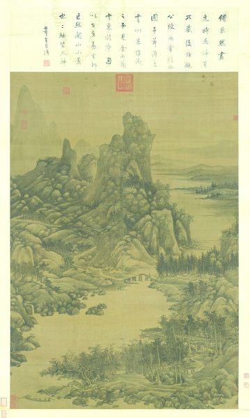 《石渠寶復(fù)》根據(jù)朱標(biāo)題跋中謂此圖畫“既秋之景”,添“秋色”二字,更名為“趙伯駒《江山秋色圖》卷”,但卻把此圖列為“次等宙一”。這說明乾隆皇帝并未將此圖當(dāng)作趙伯駒真跡,只不過是基本上沿襲舊稱而已。但無論此圖作者是誰,它都反映了宋畫在繼承傳統(tǒng)青綠山水畫法基礎(chǔ)上的完善和成熟,反映了一個(gè)時(shí)代的藝術(shù)特點(diǎn)和風(fēng)尚。其對于秋景的描繪,使得今人仍若臨境,頗為贊嘆。