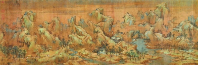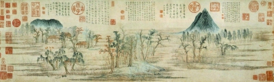 此圖曾經(jīng)明內(nèi)府收藏,清初為收藏家梁清標(biāo)所藏,后進(jìn)入清宮內(nèi)府,鈐有清內(nèi)府“乾隆御覽之寶”“石渠寶笈”等印,著錄于《石渠寶笈初編》?谷諔(zhàn)爭時(shí)期,此圖被末代皇帝溥儀攜往長春,東北解放后為人民政府所收。由于沒有款識(shí),此圖一直沿稱為趙伯駒所作。來源為其尾紙有明洪武八年朱標(biāo)題跋。