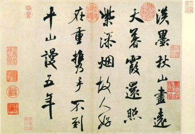 這則詩帖雖無款印,但精神飽滿,筆力雄強(qiáng),使轉(zhuǎn)靈動(dòng),結(jié)字端妍,被認(rèn)為是北宋書法家米芾中年時(shí)期的行書精品。米芾書法受二王影響,用筆灑脫俊逸,瀟灑靈動(dòng),結(jié)字險(xiǎn)勁跌宕。此《淡墨秋山詩帖》雖只寥寥二十八字,卻用筆清爽挺進(jìn)、豐潤自如,輕重緩急,渾然一體。