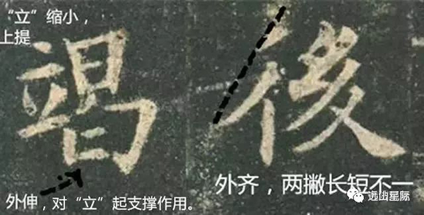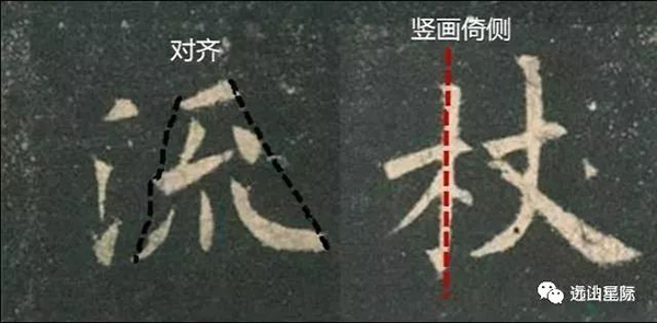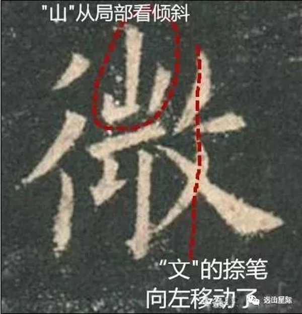 “微”的斜文旁因?yàn)槠厕喙P左移,上下兩部分沒有完全對正,屬于斜戴帽,有點(diǎn)像二流子,你不要因?yàn)闅W陽詢寫字一本正經(jīng),有時挺幽默的。這樣的還有“本”字等等。