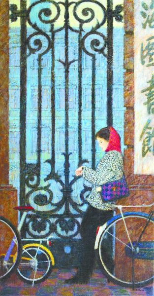 那是一個冰雪融化的初春,被動蕩歲月壓抑的求學(xué)熱情終于迸發(fā)出來。畫面中,一位青年女子倚靠在圖書館門口,略帶焦急地看著手表,顯然是早圖書館開門一步等候在門外。徐文華的油畫《晨》選取了一個特別的場景,來反映那個特殊的年代——1978年。鐵門或許也是一個時代落幕的隱喻,而青年女子鮮紅的頭巾如點睛之筆,提亮了整個畫面的基調(diào)。這幅作品曾在1979年全國美展中獲獎。