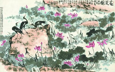 觀看此圖,最好站在十米開外,才能充分感受到作品的氣勢。這氣勢不僅源于它的體量,來自于精心的布局,更來自于飽滿的氣韻。李苦禪自傳統(tǒng)中走來,其命維新,在長方形的穩(wěn)定中求險求奇。首先請看荷塘中石塊的安排。最下方一帶露出巨石的上部邊緣,有溪澗傾瀉而過。茂盛的荷花掩映其后。左側(cè)一塊方中有圓的巨石成為視覺中心點,周圍鋪滿了荷葉與荷花。三只鷺鷥,站立石上,有昂首,有俯身,有扭轉(zhuǎn),姿態(tài)寫真,給畫面注入新的生趣。其中兩只將我們的視線引向遠(yuǎn)處,那里有汩汩溪泉,泠泠作響,右上方一塊巨石橫亙而出,不僅呼應(yīng)了畫面最下邊的巖岸,又給人一種出其不意的心理感受?喽U先生一生習(xí)字,鐘情于碑體,行草中不乏隸書之筆意。由此可悟,這一塊突兀橫生的巨石,猶如隸書中最重要的橫筆,力度沉雄,氣質(zhì)古厚。石壁之上題跋抒情,恰得其所。巨巖正下方不遠(yuǎn)處有尖頭坡岸作陪襯,極大深化了畫面的空間層次感。荷葉蔓溯其間,勁拔生長,與幾塊巨巖的橫向貫通之勢形成了鮮明的對抗態(tài)勢。這樣,畫面中既有橫線,又有縱線,縱橫交錯,滿塘生輝。從中國傳統(tǒng)道家文化上講,石為陽,荷為陰,一“硬”一“軟”,使畫中氣脈流轉(zhuǎn),生命氣象令人怦然心動。整幅作品橫縱多姿,尤以橫向開闊為主,不斷將觀者視線引向畫外更廣闊處。設(shè)色古雅,赭石與墨色交相輝映,朵朵紅荷點綴其間,不由讓人想到“接天蓮葉無窮碧,映日荷花別樣紅”的景象。