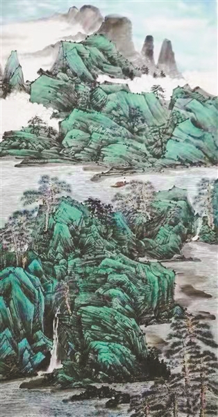 的確,他的山水作品以大氣磅礴見長(zhǎng),不拘小節(jié),講究的是畫面的大關(guān)系,以墨線為骨架,再以大色塊鋪陳畫面,一氣呵成暢快淋漓。其作品平面性強(qiáng),具有很強(qiáng)的平面設(shè)計(jì)感,將西方古典透視關(guān)系弱化,追求大色塊之間的相互關(guān)系,使得畫面遠(yuǎn)觀大氣磅礴,近看細(xì)節(jié)處豐富有趣。其強(qiáng)烈的現(xiàn)代意識(shí)和審美觀,在創(chuàng)作中逐漸擺脫傳統(tǒng)技法中程式化、模式化的枯燥套路,加強(qiáng)了畫面的視覺沖擊。