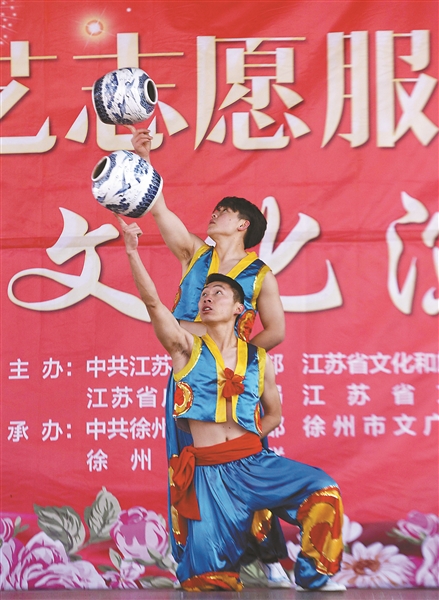 據(jù)介紹,江蘇省文聯(lián)文藝志愿服務(wù)總隊自成立以來,足跡踏遍全省的大江南北、鄉(xiāng)村街巷,今年在蘇南、蘇中、蘇北已舉行惠民演出100余場,一些前輩藝術(shù)家也自愿加入到文藝志愿服務(wù)的隊伍中來。在二隊的演出中,我省幽默雜技表演藝術(shù)家關(guān)世雄與他的搭檔為觀眾表演了幽默雜技《快樂炊事員》,幾個盤子在金屬棍的支撐下,不停地旋轉(zhuǎn),著實讓場下的觀眾捏了一把汗。