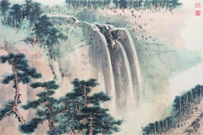 謝稚柳在這套頗為自得的山水冊中,以捕捉到的十二處丹霞景致為原型,刻畫出丹霞盛景。有橫亙的巨石、壁立的山峰、飛瀉的瀑布、虬曲的古松、搖曳的輕舟、瀲滟的碧波、迂回的山灣、朦朧的云霧,也有水村山郭、平疇綠野,更有白云深處人家。就技法與意境而言,有青綠山水、淺絳設(shè)色,也有水墨寫意;有平遠(yuǎn)、高遠(yuǎn),也有深遠(yuǎn)。在其精心醞釀與獨(dú)具匠心的造型中,我們可借此領(lǐng)略丹霞之美。謝稚柳的山水畫,多得江山之助,此畫即可見其一斑。