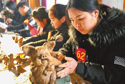 上屆大賽的一等獎得主李衛(wèi)雪今年被安排在第二組中。只見她熟練地將泥巴捏成圓滾滾的柱形,拿起竹簽扎出兩個“鼻孔”,又不慌不忙按下幾排褶子,并用竹簽勾出祥云和福袋的花紋……半個小時過后,李衛(wèi)雪的參賽作品——一只憨態(tài)可掬的泥塑小豬大功告成。