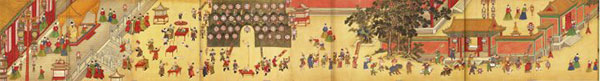 《明憲宗元宵行樂圖卷》長624厘米,寬37厘米。構(gòu)圖嚴(yán)謹(jǐn),筆法細(xì)膩,畫面上的宮廷院落巍峨壯觀,各種人物的情態(tài)、動作細(xì)致入微,繁而不雜,多而不亂,它描繪的是明朝成化年間皇宮里過元宵節(jié)的各種情景,每幅場景都有憲宗皇帝在場,他穿著不同的盛裝,或站,或坐,表情安詳,在欣賞著元宵節(jié)的各種活動。