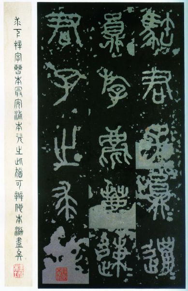 潘受先生云:“缶廬書法,沈酣于《散氏盤》,而畢生相與骨肉魂魄的,則為《石鼓》。他與《石鼓》另具錘爐,自出新意,用筆熟中有生,粗中有細(xì),凝練遒勁,拙而愈奇。”符鑄云:“缶廬以石鼓得名,其結(jié)體以左右上下參差取勢(shì),可謂自出新意,前無古人。要其過人處,為用筆遒勁,氣息深厚,然效之輒病。”馬宗霍云:“缶廬寫石鼓,以其畫梅法為之,縱挺橫張,略無含蓄,村氣滿紙,篆法掃地矣。”商承祚《論篆》云:“吳俊卿以善《石鼓文》,變《石鼓》平正之體高聳其右,點(diǎn)畫脫漏,行草,驚桀,《石鼓》云乎哉?后學(xué)扼其名,奉為圭臬,流毒匪淺,可省浩嘆!”可謂仁者見仁,智者見智。