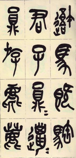 總之,《石鼓文》書法創(chuàng)作應(yīng)以自己的審美觀去理解,去取舍。任何一種碑帖都是既有精華也有瑕庇的,即使十分完美的碑帖,取舍之間也有舍與取法者性情、審美的差異,因?yàn)樵谌》ㄖ卸夹枰幸粋(gè)再組織的創(chuàng)作過程,即所謂“始在能以,繼在能舍。能舍難,然不能力取,無由得舍”。無論是取是舍,也無論是形式還是風(fēng)格,都應(yīng)以自己的主導(dǎo)風(fēng)格為基點(diǎn)。
