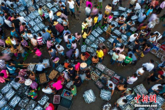 3月12日,喜迎新中國(guó)成立70周年——全國(guó)主流媒體“航拍中國(guó)”攝影圖片展在北京航空航天大學(xué)藝術(shù)館開(kāi)幕。圖為展出作品《神泉漁港忙》:2017年9月16日,俯瞰廣東惠來(lái)縣神泉漁港繁忙的魚(yú)市交易。廣東惠來(lái)縣神泉港是歷史上聞名遐邇的對(duì)外通商港口,每天凌晨2點(diǎn)后,出海打漁的船陸續(xù)回港,販魚(yú)的客商也從八方趕來(lái),原本寧?kù)o的漁港頓時(shí)熱鬧起來(lái)。中新社發(fā) 鄧飛 攝
