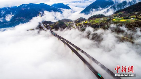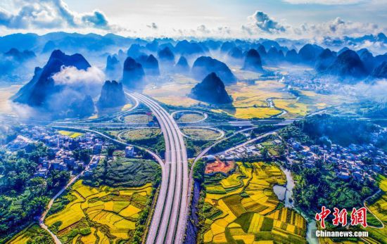 3月12日,喜迎新中國(guó)成立70周年——全國(guó)主流媒體“航拍中國(guó)”攝影圖片展在北京航空航天大學(xué)藝術(shù)館開(kāi)幕。圖為展出作品《最美廣西高速路》:2017年10月5日,廣西合浦縣到那坡縣的合那高速公路。中新社發(fā) 彭寰 攝