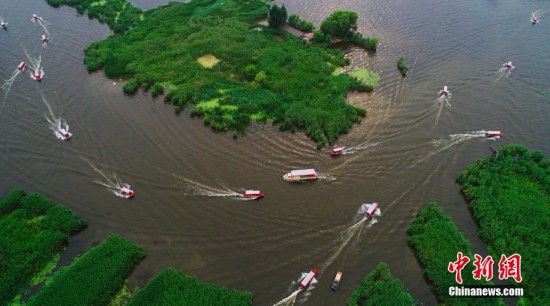 3月12日,喜迎新中國(guó)成立70周年——全國(guó)主流媒體“航拍中國(guó)”攝影圖片展在北京航空航天大學(xué)藝術(shù)館開(kāi)幕。圖為展出作品《百舸爭(zhēng)流白洋淀 千年大計(jì)在雄安》:2018年6月16日,在素有“華北明珠”之稱(chēng)的白洋淀,十幾條快艇劈風(fēng)斬浪穿行在星羅棋布的蘆葦蕩,帶領(lǐng)游客感受以水、沼澤、蘆葦、荷花、香蒲為主要景觀(guān)的原生態(tài)。白洋淀是河北省最大的湖泊,總面積336平方公里,現(xiàn)有大小淀泊143個(gè),主體位于雄安新區(qū)安新縣、容城縣、雄縣境內(nèi)。中新社發(fā) 季春紅 攝