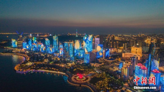 3月12日,喜迎新中國(guó)成立70周年——全國(guó)主流媒體“航拍中國(guó)”攝影圖片展在北京航空航天大學(xué)藝術(shù)館開(kāi)幕。圖為展出作品《青島之夜》:2018年6月28日,青島浮山灣畔,數(shù)十棟高樓被主題燈光裝扮的唯美唯幻,每一次畫(huà)面轉(zhuǎn)換,都能聽(tīng)到市民和游客發(fā)出的歡呼。中新社發(fā) 修相科 攝