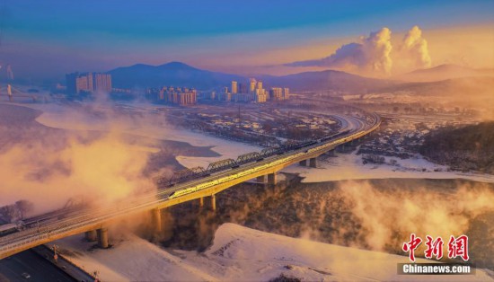 3月12日,喜迎新中國(guó)成立70周年——全國(guó)主流媒體“航拍中國(guó)”攝影圖片展在北京航空航天大學(xué)藝術(shù)館開(kāi)幕。圖為展出作品《飛越松花江》:2016年1月21日,一輛高鐵飛馳在極寒地區(qū)的吉林松花江高鐵特大橋上。中新社發(fā) 劉慎庫(kù) 攝