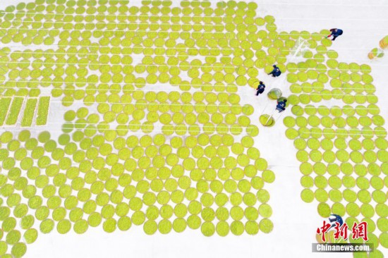 3月12日,喜迎新中國(guó)成立70周年——全國(guó)主流媒體“航拍中國(guó)”攝影圖片展在北京航空航天大學(xué)藝術(shù)館開(kāi)幕。圖為展出作品《曬茶忙》:2017年4月2日,航拍福建寧德福鼎市鼎白茶廠(chǎng),工人正在忙碌曬茶的場(chǎng)景。中新社發(fā) 林祖賢 攝