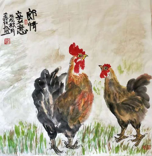 畫面上有氣勢宣昂的雄雞,迎著朝陽的鳴雞,也有慈母般的母雞呵護小雞,也有兩雞相長伴于田園,籬下纏綿的雙侶,觀者看后身臨其境,有田園生活氣息撲面而來的感受。真是佳作不斷,幅幅給觀者驚喜。