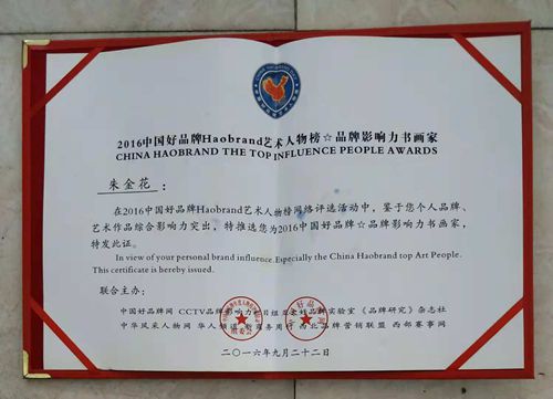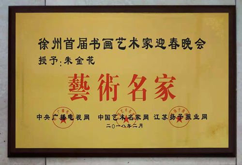 2018年2月,中國廣播電視網(wǎng)、中國藝術名家網(wǎng)、江蘇揚子報業(yè)網(wǎng)授予朱金花為“藝術名家”。