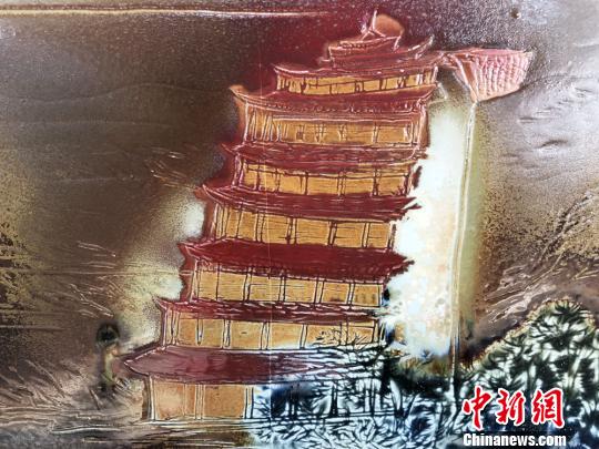 圖為主題為莫高窟九層塔的瓷板畫作品。 徐雪 攝