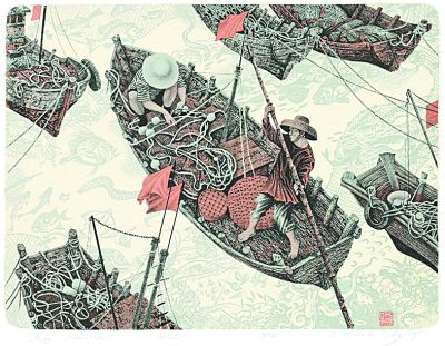 紅衣漁民(版畫)奧列格·米哈伊洛夫(俄羅斯)