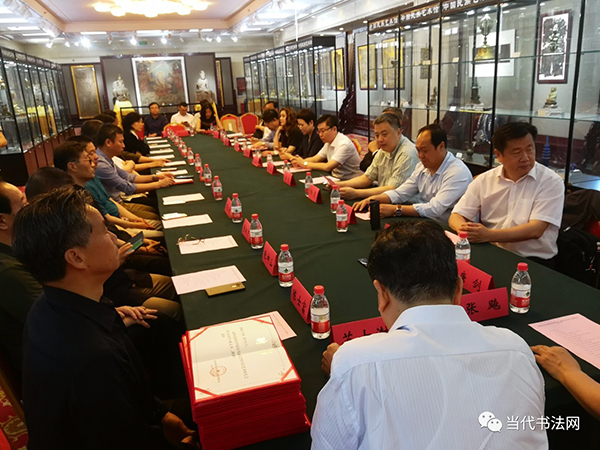 會(huì)上,中國(guó)書法家協(xié)會(huì)主席蘇士澍先生致辭,研究會(huì)會(huì)長(zhǎng)李少青宣布了藝術(shù)委員會(huì)組成名單和學(xué)術(shù)交流中心人員組成,并為蘇士澍、張飆頒發(fā)了藝委會(huì)名譽(yù)主任、主任聘書;蘇士澍主席、張飆主席為藝委會(huì)執(zhí)行主任、副主任頒發(fā)聘書;張飆主席、李少青會(huì)長(zhǎng)為藝委會(huì)委員和學(xué)術(shù)交流中心主任、副主任頒發(fā)聘書。