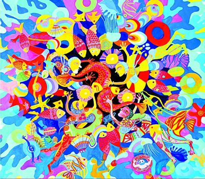 波光閃爍的藍色水中,戴著泳帽和套著泳圈的游泳者,臉上洋溢著開心歡樂的笑容,身邊多彩的魚兒悠游自在……《盛世歡歌》的畫面構成了具有向心力的圓形,精巧的構圖、活潑的曲線、對比強烈的裝飾性色彩,以及對民間美術的借鑒,烘托出新中國70華誕普天同慶、盛世歡歌的濃烈氣氛。