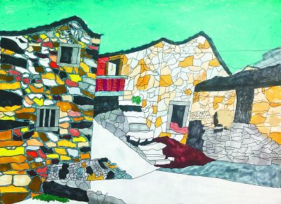 汪若羲的《七彩樟腳村》描繪的是海邊及海島的景色。樸實的線條,平涂的色塊,大海和地面單純的顏色與石屋的豐富色彩相互對比,用五顏六色的石料堆砌的建筑顯得艷麗而厚重,表現(xiàn)了祖國地大物博,人們因地取才,營造與資源相適應的生活環(huán)境的故事,反映出人們勞作不輟、生生不息的頑強意志。