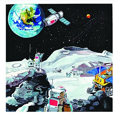 作品《大國氣象 中國力量》則運用了月球、火箭、衛(wèi)星、高鐵、長城等多種形象,有趣的是,畫面中的高鐵車廂被幻化成躍動的龍形,從而賦予了作品騰飛的寓意。畫面的主體是一位宇航員,通過其頭盔上的鏡片,映照出中央電視臺大樓、國產大飛機C919和天壇祈年殿。這反映出小作者金拓宇的智慧,既增加了畫面的形象元素,突出了表現(xiàn)的主題,又巧妙地解決了畫面空間不足的問題。小作者打破了時空的局限,以聯(lián)系古今的方式,強調了祖國歷史文化的璀璨和現(xiàn)代文明的發(fā)達。