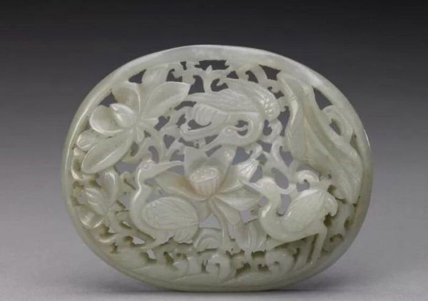 明青玉透雕鷺鷥蓮花紋橢圓形嵌件,現(xiàn)藏故宮博物院