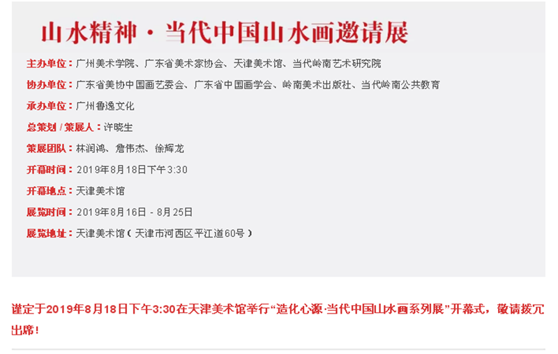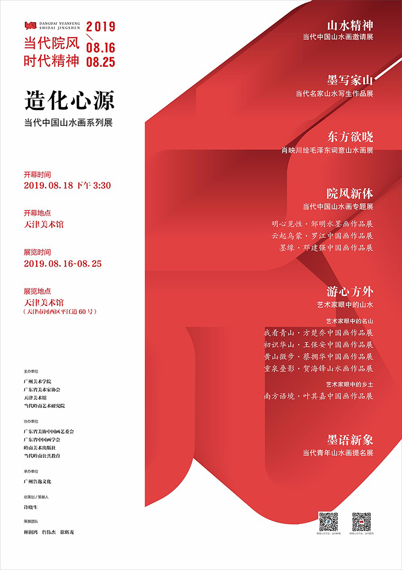 本次展覽以“山水精神”為題,邀請匯聚了當代中國畫壇具有代表性的老中青三代40位藝術(shù)家的新近力作,展開跨域南北的藝術(shù)交流。此展將各地山水畫家佳作精品薈萃于天津,展呈當代山水畫壇中堅力量的創(chuàng)作狀態(tài),基本代表了當代山水畫創(chuàng)作研究的學術(shù)水準與整體面貌。觀眾盡可從展覽所呈現(xiàn)的壯麗的山水圖景中一睹當今山水畫的新氣象,領(lǐng)悟畫作中所傳遞出來的山水精神。