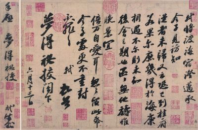 東坡先生深知此去即是永別,他很傷感地跟患難中的朋友一一道別。在?诙珊G埃窘(jīng)澄邁的東坡先生給老友趙夢(mèng)得寫(xiě)了封信,這封信到現(xiàn)在還保存著,就是有名的《渡海帖》,全文如下: