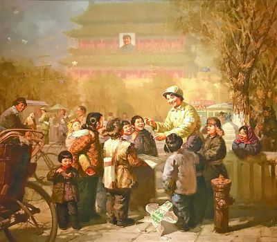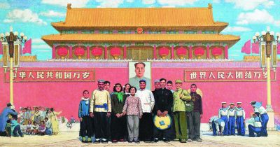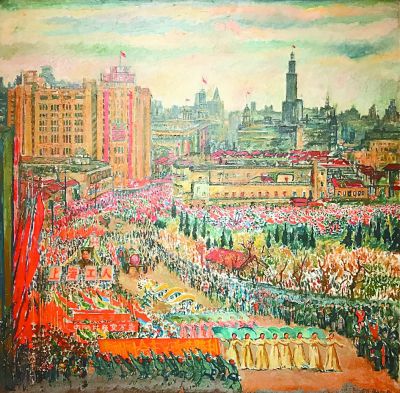 第二篇章“艱苦奮斗:國家建設之路”,主要展現(xiàn)新中國欣欣向榮的時代氣象和輝煌的建設成就。中國藝術家們深入生活,關注現(xiàn)實,以現(xiàn)實主義的創(chuàng)作手法,表現(xiàn)自豪、幸福的中國人民和改天換地的新中國建設景象。展覽現(xiàn)場,張京生、王元珍的油畫《沒有共產黨就沒有新中國》,劉海粟的油畫《慶祝社會主義改造勝利》,孫滋溪的油畫《天安門前》,吳云華的油畫《跨過鴨綠江》等佳作引人注目。這一時期,中國美術的創(chuàng)作主題呈現(xiàn)出前所未有的寬廣性,大批思想性和藝術性俱佳的作品傳達了蓬勃向上的精神與力量。