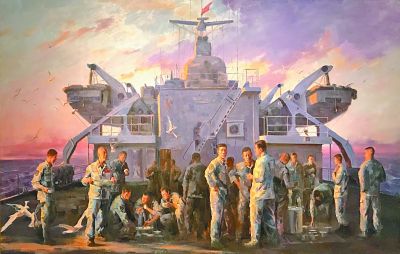 第四篇章“偉大夢想:民族復興之路”,展示了黨的十八大以來,在中華民族走向偉大復興的歷史新征程中,中國人民意氣風發(fā)的時代風采和祖國建設的輝煌成就。一排排即將發(fā)動的列車重疊構成了畫面的主體,錯落的筆觸為作品增添了細節(jié),張靜的中國畫《中國速度》以充滿設計感的造型方式呈現(xiàn)了中國高鐵的發(fā)展面貌,讓人耳目一新。由國家主題性美術創(chuàng)作研究中心團體創(chuàng)作的油畫《G20杭州峰會:向世界傳遞中國聲音》描繪了各國記者在會場里進行直播報道的盛況,對稱的構圖莊嚴肅穆,明麗的色彩時尚大氣,畫面中無處不在的中國元素彰顯著大國形象。陳堅的水彩畫《二零一五年九月三日》記錄了2015年抗戰(zhàn)勝利70周年閱兵的宏大場景,天空中的戰(zhàn)機與陸軍部隊整齊排布,鳥瞰的視角和大面積的天空營造出開闊之感。此外,孫昌武的油畫《小康之家》、李傳真的中國畫《夕陽頌歌》、曹巍的油畫《科技創(chuàng)業(yè)的年輕人》等作品描繪了新時代里各個年齡階段、各行各業(yè)的人們幸福而忙碌的平凡生活;時衛(wèi)平的油畫《極地考察·雪龍?zhí)栺傔M北冰洋》、劉偉佳的油畫《穿越江河湖海——中國奇跡工程南水北調》、周吉榮的版畫《貴州“天眼”》等作品聚焦新成就,謳歌新時代;周武發(fā)的油畫《南海之晨》,周長春的油畫《和平使命·藍色交響曲》,萌芳、邸可新、殷亮的油畫《颶風營救·澳門駐軍首次“天鴿”救援》等作品則反映出新時代強軍建設的成果和軍人的風采。一系列的優(yōu)秀作品展現(xiàn)了新時代我國社會主義建設的偉大進程、社會生活的巨大變革、人民群眾的幸福生活和昂揚向上的精神風貌,譜寫了一曲新時代的動人華章。