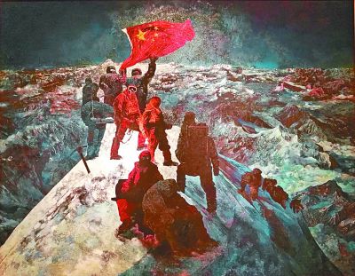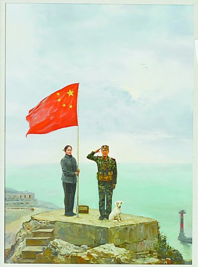 國旗是國家主權(quán)的象征。陸地邊關(guān),海上邊防線,祖國領(lǐng)空……國旗高揚,便宣示著中華人民共和國主權(quán)的確立和不容侵犯。在柯如山的油畫《雪域巡疆圖》中,戰(zhàn)士們頂風冒雪跋涉在空氣稀薄的青藏雪原,一面鮮艷的五星紅旗在茫茫雪山間格外醒目,這一抹鮮紅,是整個畫面的“畫眼”,使得畫面色彩對比強烈,把高原戰(zhàn)士們不畏艱險守衛(wèi)祖國邊疆的精神無聲地傳達出來。牟達器、付巍巍、張貫一創(chuàng)作的油畫《邊境線上活界碑——魏德友》,表現(xiàn)了新疆生產(chǎn)建設兵團退休職工魏德友五十多年如一日扎根艱苦偏遠地區(qū)巡邊護邊的感人形象,迎風招展的五星紅旗如天邊的紅霞,照亮了祖國的邊疆。在米巧銘根據(jù)王繼才和王仕花夫婦堅守開山島、守衛(wèi)祖國海防線的感人事跡而創(chuàng)作的油畫作品《孤島衛(wèi)士》中,王仕花手握旗桿,王繼才正在向國旗敬禮,海天寂靜,五星紅旗映照著主人公偉大的心靈,灼灼閃耀。