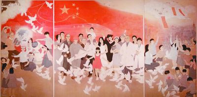 “我們?nèi)f眾一心,冒著敵人的炮火,前進,前進,前進進。”正像尚可、陳世寧、張承志、許朝暉的漆畫《萬眾一心》所描繪的場景一樣,國旗飄揚,白鴿飛舞,五十六個民族的中華兒女萬眾一心,昂首仰望。鮮艷的五星紅旗,是號召沖鋒的旗幟,是炎黃子孫心中燃燒的火焰,是盛世中奮進的夢想。