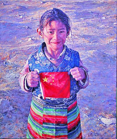 國旗是中華兒女心靈的紐帶。在表現(xiàn)和平解放西藏主題的作品,如韓書力的《高原祥云·和平解放西藏》、趙友萍的《百萬農(nóng)奴站起來》中,在描繪香港、澳門回歸祖國,如廖宗怡、張樹軍的《1997·香港防務交接》,羅田喜的《使命—歡送駐港部隊》,徐里、譚乃麟的《不忘初心,堅持“一國兩制”,香港的未來一定更美好》,邢俊勤等的《澳門回歸》中,在表現(xiàn)中華兒女一家親,如李紹忠的《兩岸同胞兄弟情》、王其鈞的《身遠心近》等畫作中,五星紅旗或在旗桿上高高飄揚,或在人們手中輕輕揮舞。一面國旗,牽動著炎黃子孫對祖國的愛與深情,當“我和我的祖國”歌聲響起,當國旗在藍天白云下舞動,祖國就在身邊,那樣生動,那樣親切。