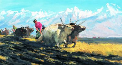 不過(guò),這期間也有不少畫(huà)家進(jìn)行了難得的嘗試。同樣是女性題材,董希文的《千年土地翻了身》、朱乃正的《金色的季節(jié)》在以女子健壯體魄展現(xiàn)青藏高原雄渾之美的同時(shí),以恰到好處的女性曲線部分消抵了“鐵姑娘”特征,撲面而來(lái)的女性氣息讓畫(huà)面增添一抹柔美。