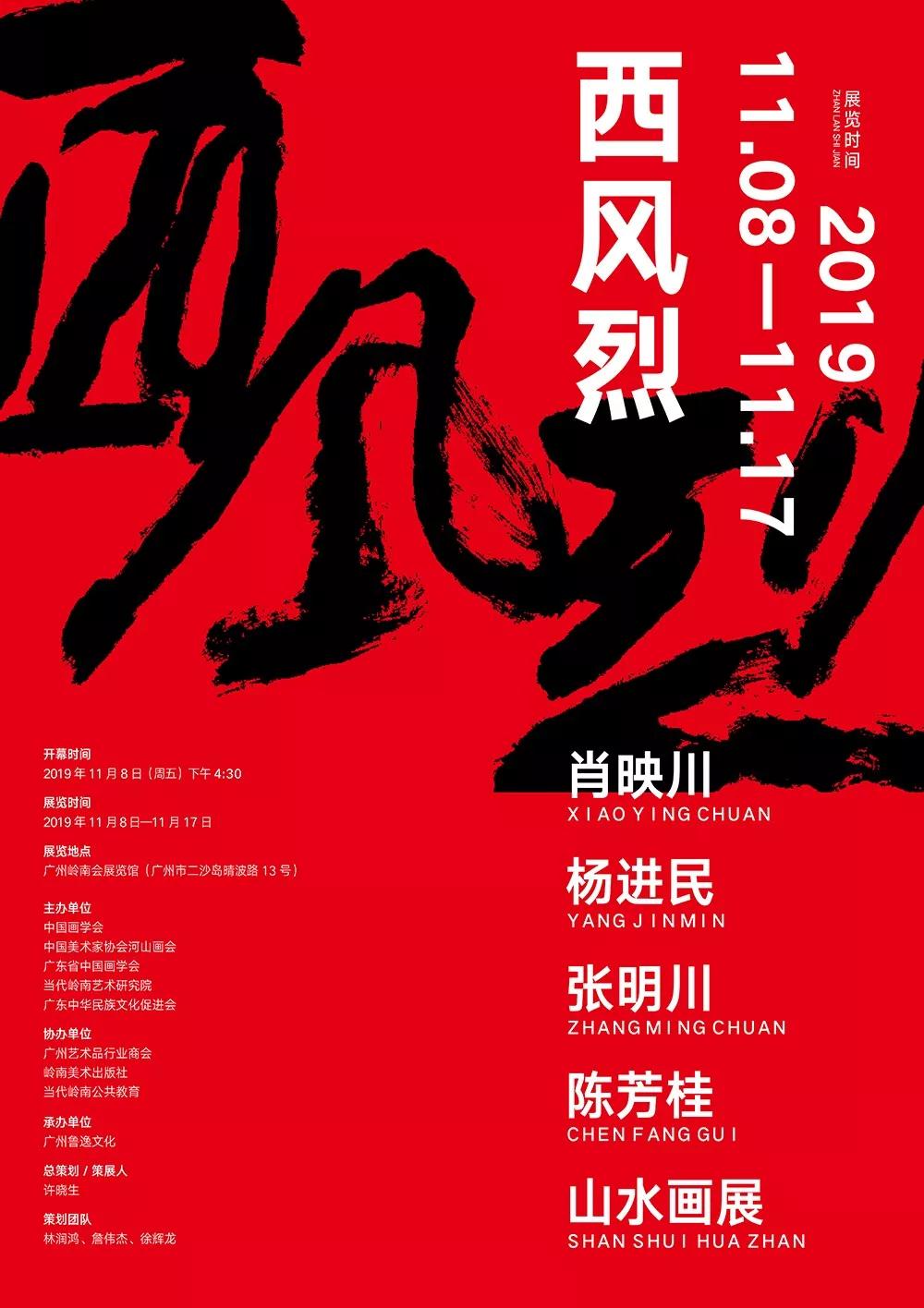2019年11月3日下午,“西風(fēng)烈 · 肖映川、楊進(jìn)民、張明川、陳芳桂山水畫展”在廣州嶺南會開幕。展覽由中國畫學(xué)會、中國美術(shù)家協(xié)會河山畫會、廣東省中國畫學(xué)會、當(dāng)代嶺南藝術(shù)研究院、廣東中華民族文化促進(jìn)會主辦;廣州藝術(shù)品行業(yè)商會、嶺南美術(shù)出版社、當(dāng)代嶺南公共教育協(xié)辦;廣州魯逸文化承辦;許曉生擔(dān)任總策劃及策展人。