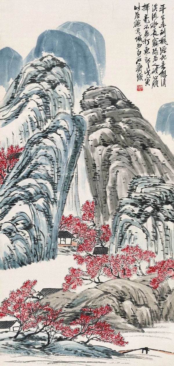 山水作品,《桃花源》則描繪了齊白石內(nèi)心深處的一處避風(fēng)港。畫中除描繪桃花源的美景,但卻不見隱居桃花源的鄉(xiāng)親,叢林中的房間屋舍也皆躲躲藏藏。原來創(chuàng)作這幅作品正值抗日戰(zhàn)爭時(shí)期,北平淪陷,民不聊生。75歲高齡的齊白石,在家閉門作畫。畫家體味到了一千五百年前陶淵明的內(nèi)心苦楚,他不愿把山外戰(zhàn)亂紛爭的消息帶到內(nèi)心所營造的一片凈土中,破壞桃源人安寧平靜的生活。因而畫面空無一人,屋舍也都躲起來,讓人不禁感慨白石老人的畫外之意。