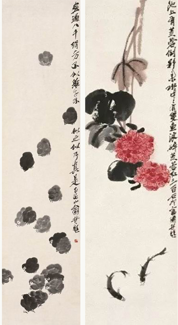右:《芙蓉小魚圖》軸 133cm×33cm