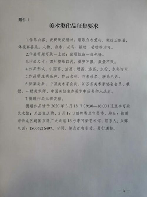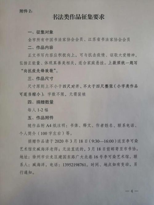 四、捐贈數量每人1-2幅五、作品附件隨作品附A4紙注明:書體、釋文、作者姓名、聯(lián)系電話、個人簡介(100字左右)等。捐贈作品請于2020年3月18日(9:30—16:00)送至李可染藝術館交臧海洋老師;無法直送的,3月18日前郵寄至市書協(xié),地址:徐州市云龍區(qū)建國東路廣大北巷16號李可染藝術館,聯(lián)系人:臧海洋,電話:13952198761。時間、地點如有變動,另行通知。