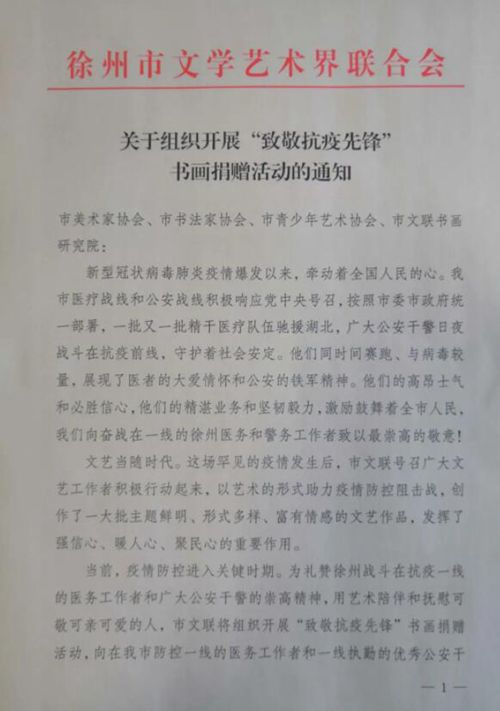 當前,疫情防控進入關鍵時期。為禮贊徐州戰(zhàn)斗在抗疫一線的醫(yī)務工作者和廣大公安干警的崇高精神,用藝術陪伴和撫慰可敬可親可愛的人,市文聯(lián)將組織開展“致敬抗疫先鋒”書畫捐贈活動,向在我市防控一線的醫(yī)務工作者和一線執(zhí)勤的優(yōu)秀公安干警代表每人獻上一副書畫作品。希望全市美術家、書法家拿起手中的筆,飽含深情地創(chuàng)作,描繪最美的“逆行者”,謳歌眾志成城的感人故事,抒發(fā)對美好生活的向往。作品將由市美術家協(xié)會、市書法家協(xié)會統(tǒng)一收件、裝裱,并由市文聯(lián)與市衛(wèi)健委、市公安局等聯(lián)合頒發(fā)捐贈證書。