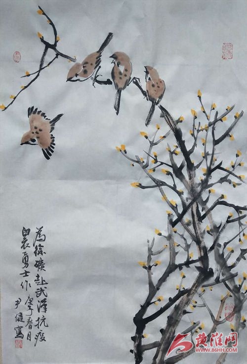 為了用藝術(shù)的形式表達(dá)對(duì)白衣勇士的崇敬之情,以微薄之力支持疫情防控阻擊戰(zhàn),黃淮網(wǎng)副總編輯、書法報(bào)徐州站站長尹健創(chuàng)作了一批花鳥畫作品,擬捐贈(zèng)給徐礦集團(tuán)赴一線抗疫的英雄們,祝福他們?cè)缛掌桨矂P旋,未來生活幸福!