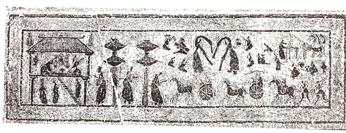 早期圖像比較單一,有長青樹、小鳥、懸璧、廳堂、幾何紋飾等。中期出現(xiàn)刻有建筑、拜謁、格斗、出行、門吏、生產(chǎn)、生活及其祥瑞圖式與神話故事。畫像的雕刻技法多為陰線刻與凹面陰線刻。如徐州沛縣棲山一號漢畫像石槨墓,這座墓是1977年農(nóng)民在采石時發(fā)現(xiàn)的,發(fā)掘者認為應該是新莽時期的。