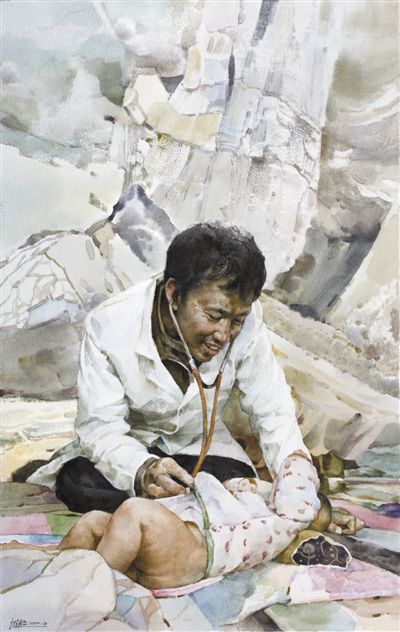 劉永健水彩畫《心系蒼生》——圣潔的白色,飽含醫(yī)務(wù)人員對(duì)生命的敬畏,照亮以仁心仁術(shù)造福人民的信念。 |