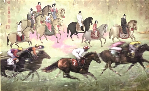 本次畫展除了抽象作品外,還展出了三張寫實油畫。周穎超介紹,這三張作品特別有代表性,其中一幅《遭遇虢國夫人》將唐朝貴婦出行與西方馬球運動在一張畫布上體現(xiàn),作品反映的其實是一種時空的轉(zhuǎn)變、對慢生活和快節(jié)奏社會現(xiàn)象的思考。還有一幅《任正非》的肖像,畫面彰顯出任正非的雍容大度、不卑不亢的精神,表達了中國人的志氣和堅韌。